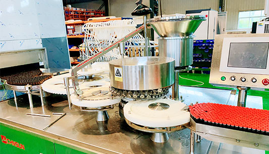 采用超聲波清洗及水氣交替沖洗、熱風循環式高溫滅菌、多頭灌裝與封口等技術。整線聯動自動控制。操作簡單方便,實現了機電一體化。