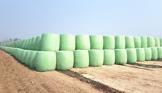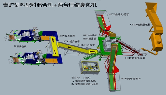 青貯飼料稱重配料→攪拌混合→自動進料→壓縮成捆→預包膜→物料輸送→最終包膜→成品輸出